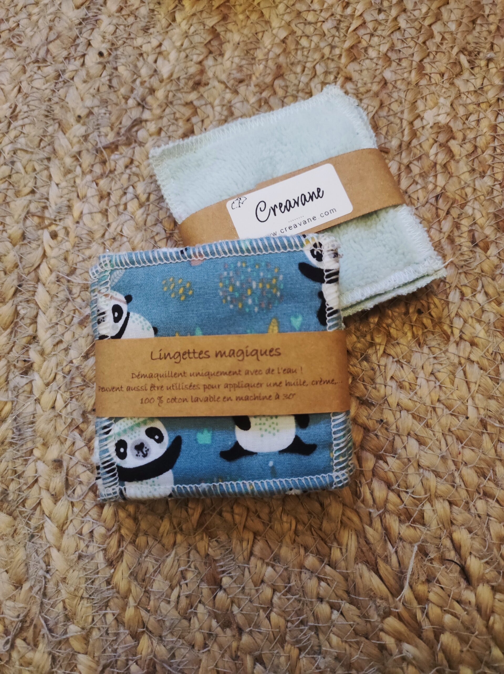 - La face nettoyante varie suivant l’arrivage de tissu. Elle peut être blanche, écru, crème, bleue claire, bleue foncée, rose pale, vieux rose, saumon, corail, vert d'eau, turquoise, vert canard, grise claire, grise foncée, noire,... La couleur sera toujours choisie pour être assortie au tissu décoratif de la lingette.
